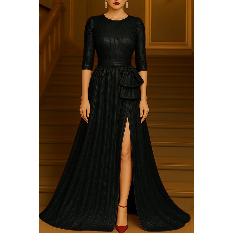 A-Line Floor Length Evening Gown Ball Gown Formal Dress Elegant 3/4 Length Sleeve Crew Neck Wedding Formal Lurex Fabric with Glitter Pleats