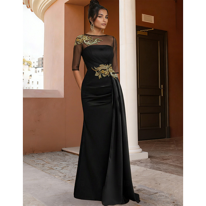 Sheath Column Floor Length Evening Gown Ball Gown Ball Gown with Overskirt Formal Dress Elegant Glittering Silky Half Sleeve Illusion Neck Wedding Formal Satin Cowl Back with Glitter Pleats Appliques