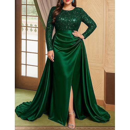 Abito a-line lungo fino al pavimento abito da sposa abiti formali abito da sera abito madre della sposa maniche lunghe scollo tondo elegante vintage festa satinato con pieghe paillettes spacco