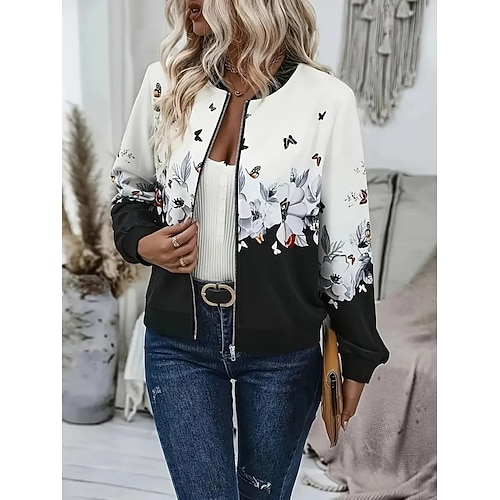 Damen Bomberjacke Freizeitjacke Bequem Atmungsaktiv Reißverschluss Druck Lässig Blumen Urlaub Straße Lässig Alltagskleidung Reisverschluss Kurz Stehkragen Normale Passform Langarm Oberbekleidung