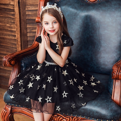 Abito da damigella d'onore bambina Ragazze Abito formale Abiti da sposa Feste Matrimonio Formale Adorabile Principessa Patchwork Rete Stella Manica Corta Girocollo Nero Rosa Dai 4 anni in su