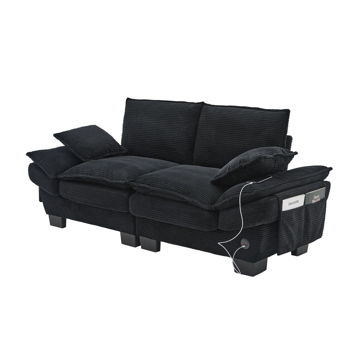 Merax 2-Sitzer-Sofa mit USB-C-Anschluss & Seitentaschen, Dicke Kissen, Corduroy, Schwarz