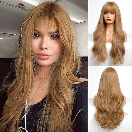 ombre biondo capelli lunghi ricci capelli lunghi con frangia aspetto naturale parrucca sintetica resistente al calore festa di gioco quotidiana adatta a donne alla moda 26 pollici