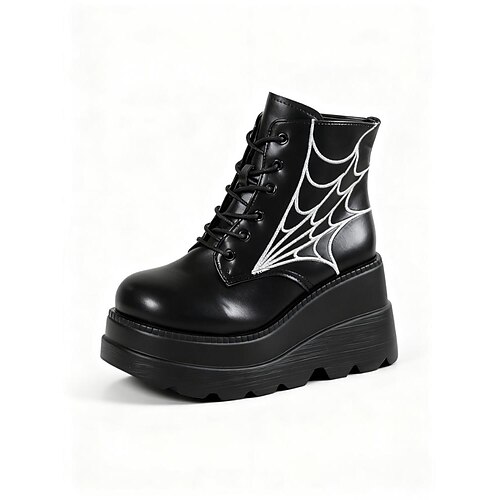 Schwarze Plateaustiefeletten für Damen mit Spinnennetz-Design – klobige Schnürstiefeletten für Halloween, Cosplay und Maskenbälle, Punk- und Gothic-Stil, bequem für den ganzen Tag