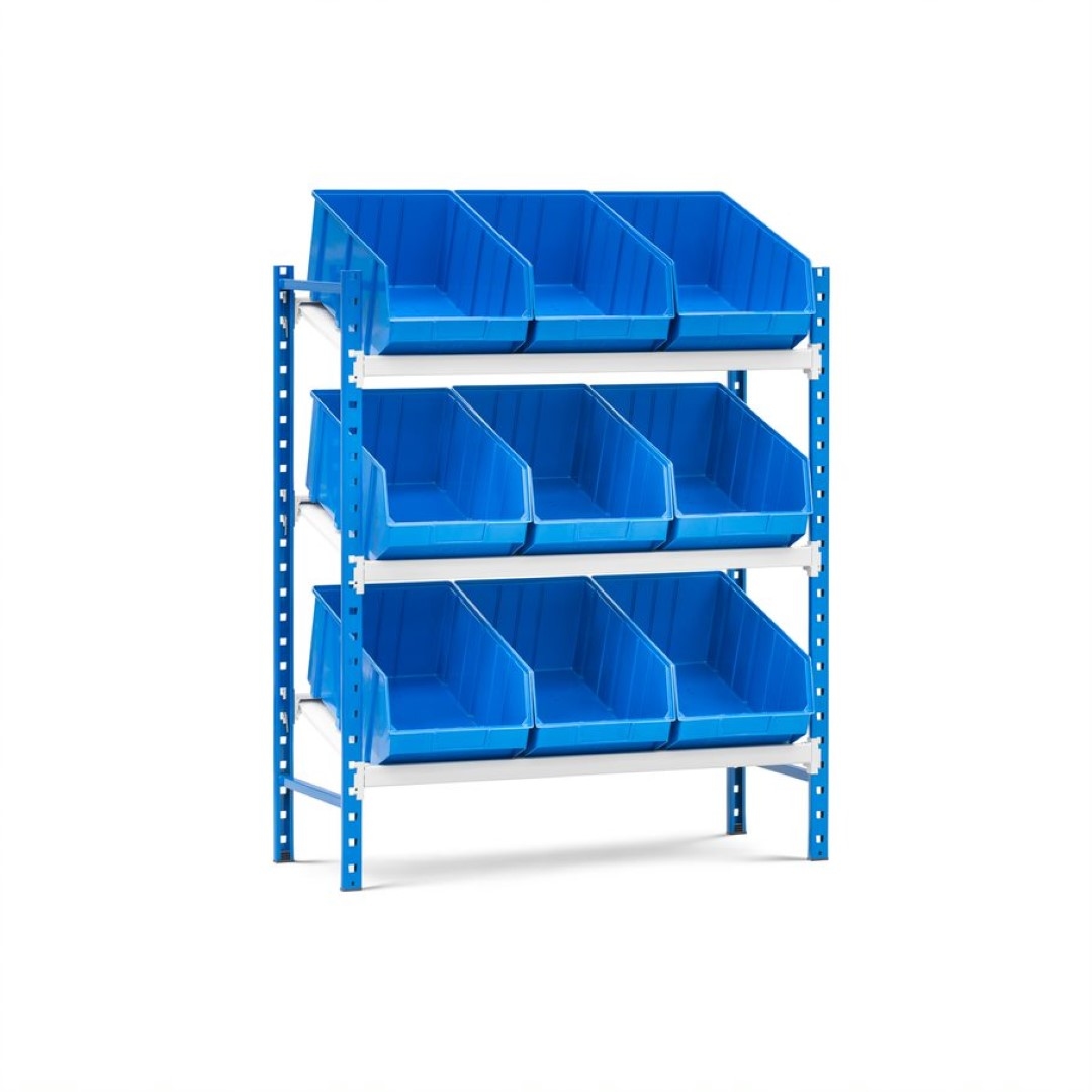 PROREGAL Schrägbodenregal MAXIMUS mit 12x Sichtlagerboxen à 31,5L Fachlast 130kg Grundregal HxBxT 160x100x40cm 4 Ebenen Lichtblau/Lichtgrau