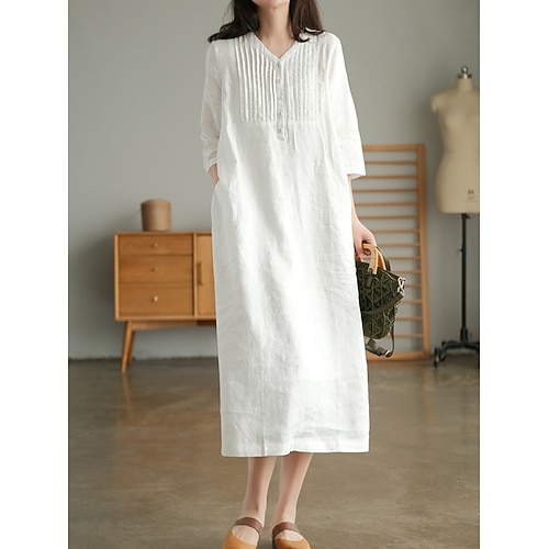 Per donna Abito Midi Abiti ispirati al lino Abito in cotone e lino Essenziale Classico Moderno Quotidiano Ferie Weekend Vestibilità regolare Semplice Manica Lunga Scollo a V Rosa Verde Albicocca