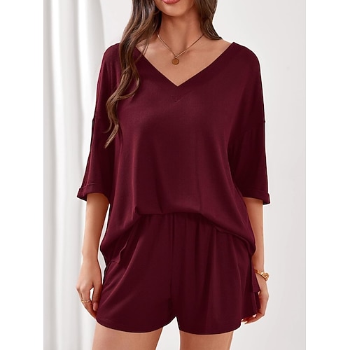 Per donna Set di Pantaloncini Manica 3/4 Scollo a V Tinta unica Moda Streetwear Casuale Quotidiano All'aperto Blu Nero Vino Estate Vestibilità regolare