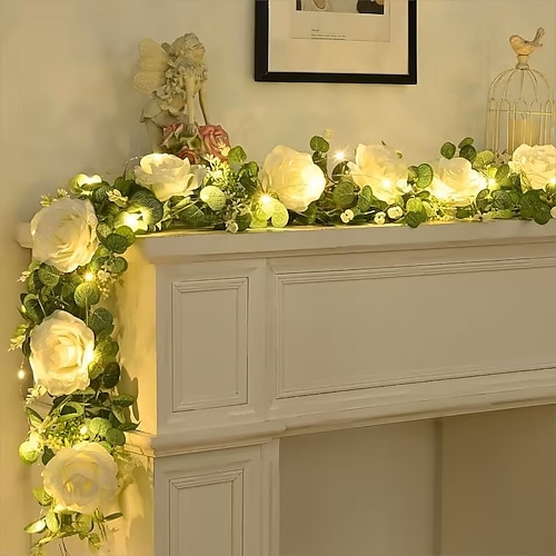 Ghirlanda di rose artificiali con luci a stringa da 2 m, 20 LED, alimentazione a batteria, 8 fiori finti e piante verdi per San Valentino, feste di matrimonio, compleanni, casa, camera da letto,