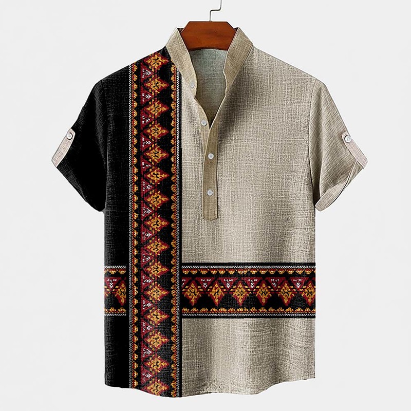 Men's Geometric Pattern Ethnic Shirt Button Down Shirt Short Sleeve Vintage Retro Holiday Casual Daily Summer Spring Standing Collar Henley Collar 3D Print Linen Like Shirt Dark Khaki Green Khaki