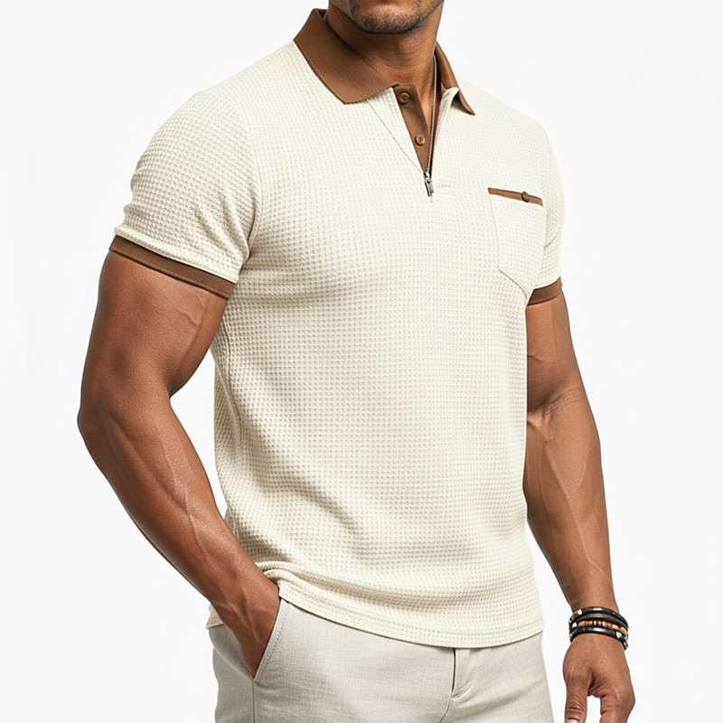 Men's Textured Business Polo Work Casual Lapel Classic Short Sleeve Basic Modern Color Block Patchwork Pocket Spring Summer Regular Fit Light Yellow milk white khaki Gray Textured