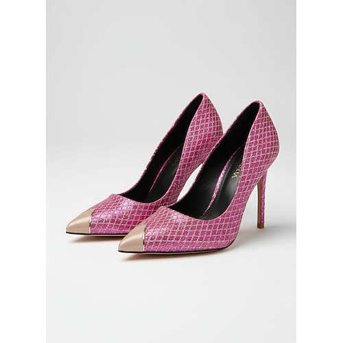 Décolleté da donna rosa con punta a punta in pelle di serpente, eleganti scarpe con tacco alto per cocktail party e balli di fine anno. eventi serali