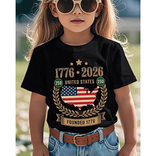 100% Cotone Bambini Ragazze Nero Grafico Bandiera USA 250° anniversario Bandiera americana per bambini Maglietta Girocollo Manica Corta Vacanza Sport Outdoor Abbigliamento Quotidiano Attivo Vacanza