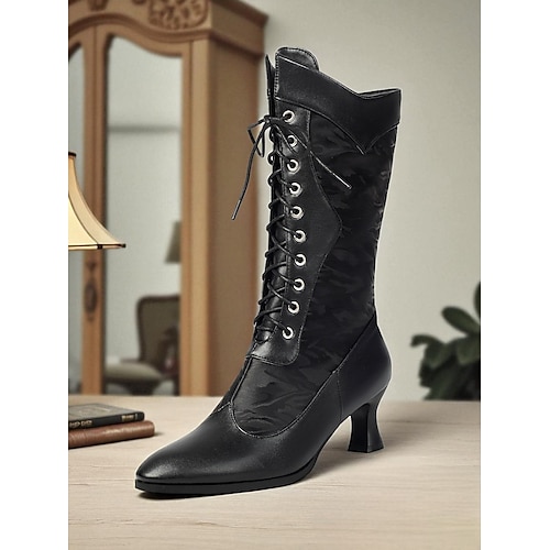 stivaletti alla caviglia con lacci neri vittoriani da donna degli anni '20 - scarpe retrò in pelle con tacco a gattino per costumi storici, spettacoli teatrali o abiti autunnali vintage