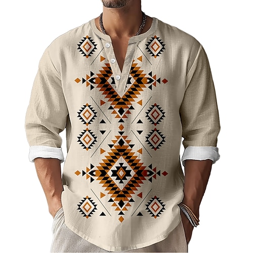 Herren Ethnisch Hemd Knopfhemd Henley Hemd Langarm Lässig Tribal Urlaub Lässig Ferien Sommer Frühling Herbst Kragenlos V Ausschnitt Druck Beige