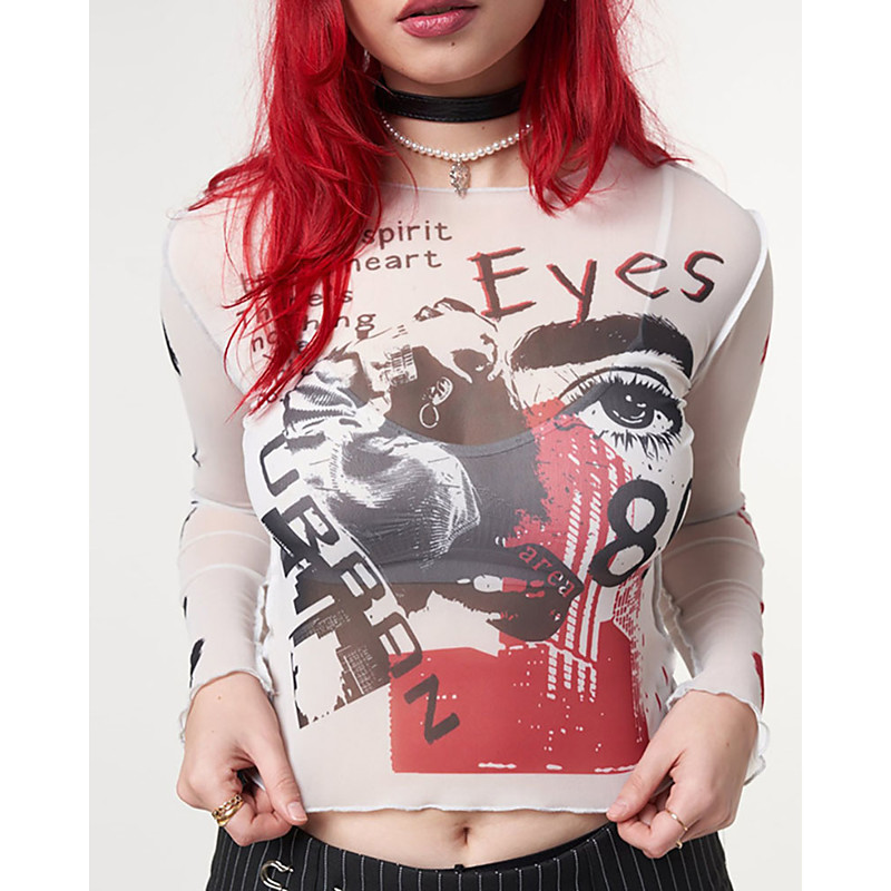 Women's Blouse Graphic Abstract Vintage Stylish Sexy Long Sleeve Crew Neck Crop Tops Holiday Going out Mesh Black White Yellow Green Summer Spring Fall