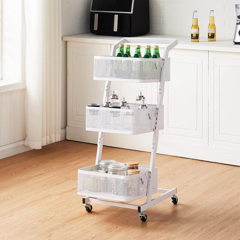 CLIPOP 3 Tier Utility Rolling Cart, Kitchen Vegetable Trolley with Handle and Lockable Wheels, Metal Adjustable Mesh Basket Storage Rack for Fruits, Vegetables, Books,Tools, White