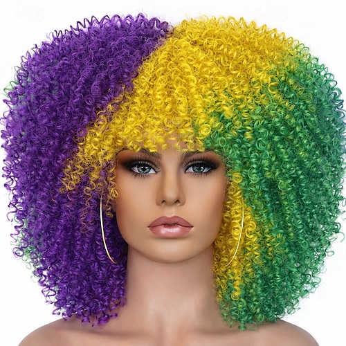 Parrucca di Carnevale Viola Verde Gialla Afro Riccia Corta Sintetica Parrucca per Festival Mardi Gras Parata Costume Cosplay Capelli per Donne