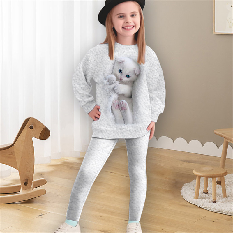 Girls' 3D Cat Sweatshirt Legging Set Long Sleeve 3D Print Spring Fall Active Fashion Daily Kids 4 years Crew Neck Outdoor Vacation Date Regular Fit
