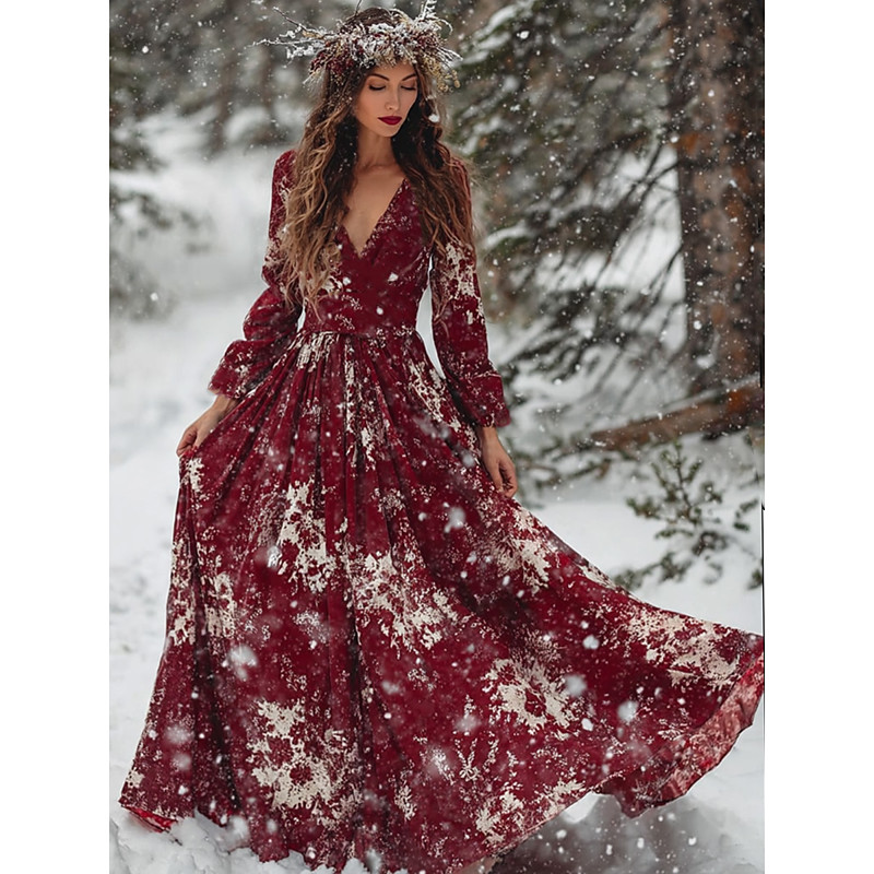 Women's Snowflake Maxi Dress Pleated Dress Party Casual Boho Daily Date Going out Regular Fit Graphic Long Sleeve V Neck Wine Green Fall Winter