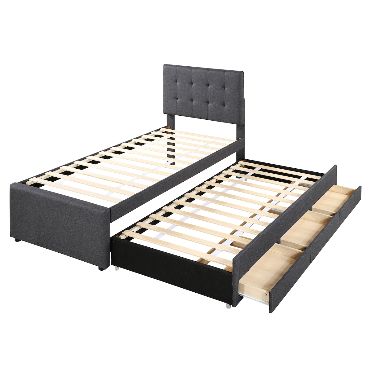 Merax Polsterbett, Doppelbett, Familienbett, mit drei Schubladen, ausziehbares Bett, Verstellbares Kopfteil, Grau, 90x200cm