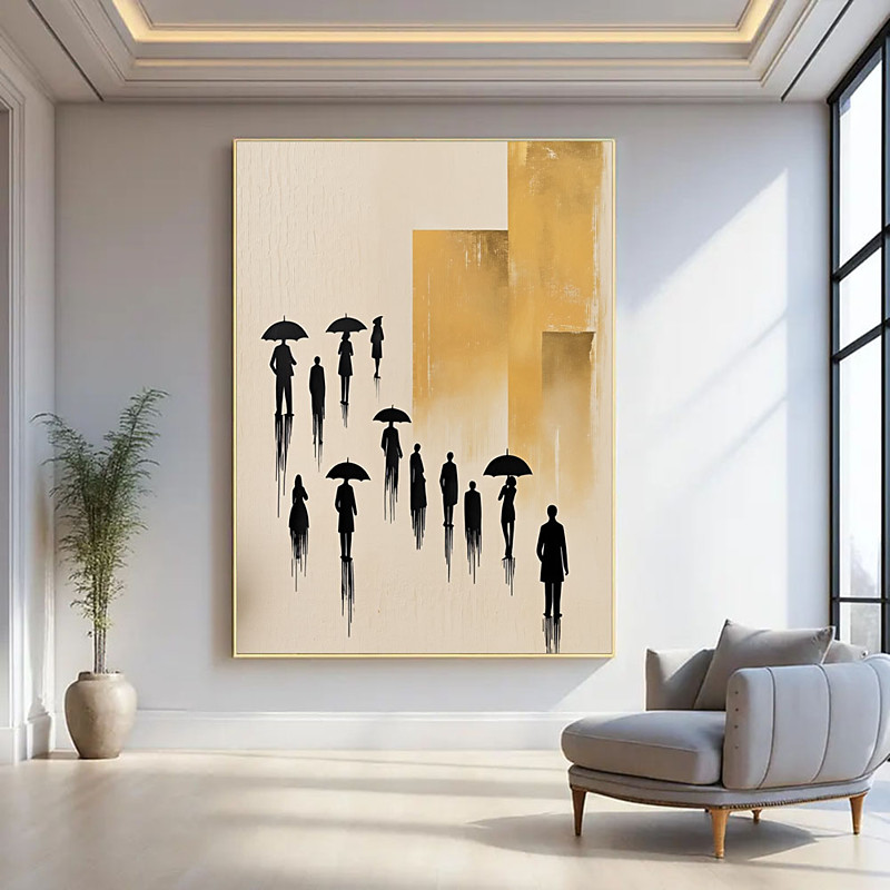 New Art Hand Painted High-Q Gold Foil City Abstract Oil Painting On Canvas People Walking in Rain Home Decor Wall Pictures Modern Picture