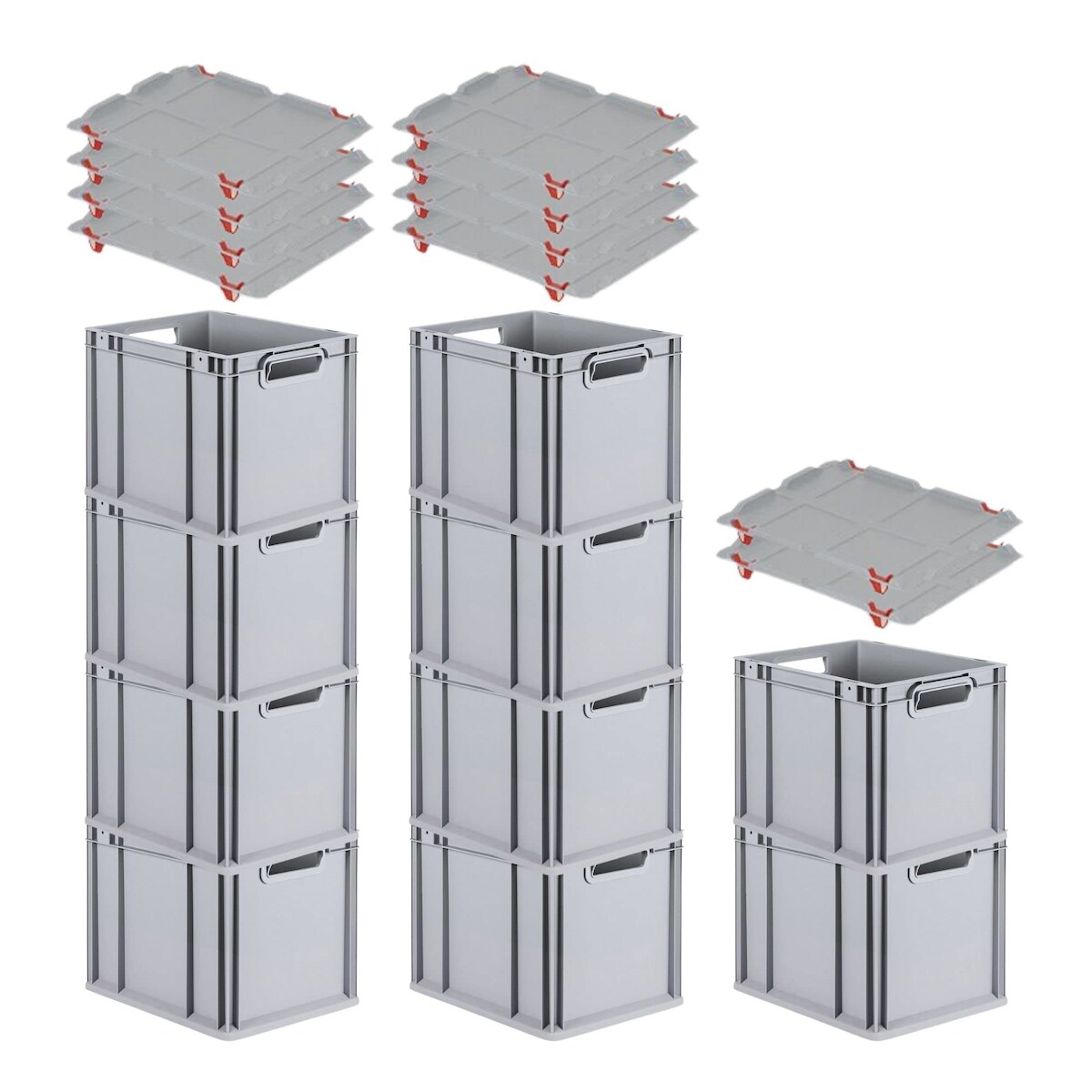 PROREGAL SparSet 10x Eurobox NextGen Economy mit Auflagedeckel & 4x Verschlüsse Rot, Griffe offen, HxBxT 32x30x40cm, 30L, Eurobehälter, Box