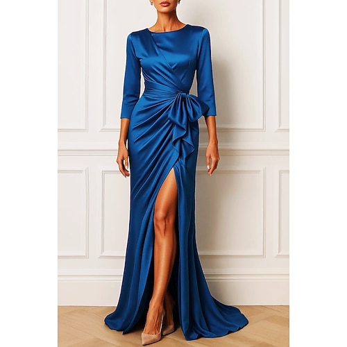 Linea ad A Lunghezza al pavimento Abiti da Ballo Abito da Sera Da principessa Elegante Spacco Alto Manica 3/4 Girocollo Matrimonio Formale Raso con Fiocco/Fiocchi Pieghe Volant