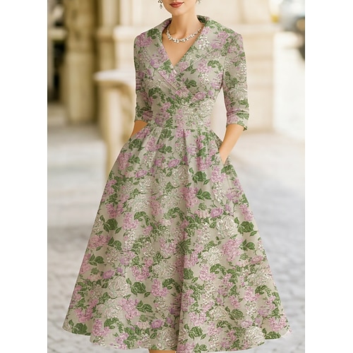 Linea ad A Lunghezza Tè Vestito da Festa Abito da Cocktail Abito da invitata a nozze Abito da Sera Elegante Vintage Manica 3/4 Colletto a Camicia Matrimonio Formale Jacquard con Tasca