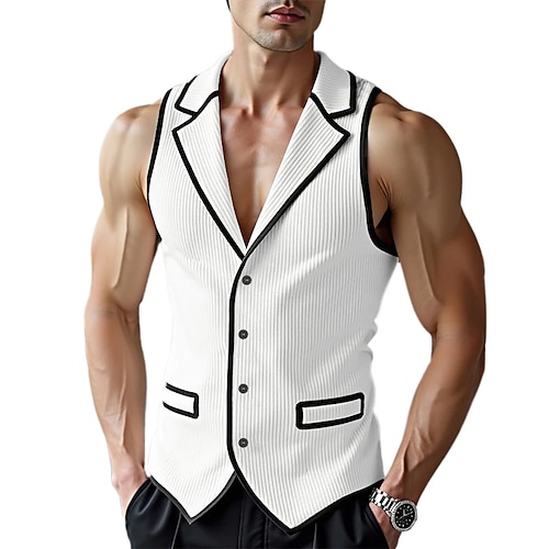 Herren Tank Top Cordhemd Ärmelloses Shirt Ärmellos Rundhalsausschnitt Sommer Frühling Farbblock Grubenstreifen Mode Designer Muskel Knopf vorne Outdoor Ausgehen Schwarz Weiß Hellblau Top T-Shirt für