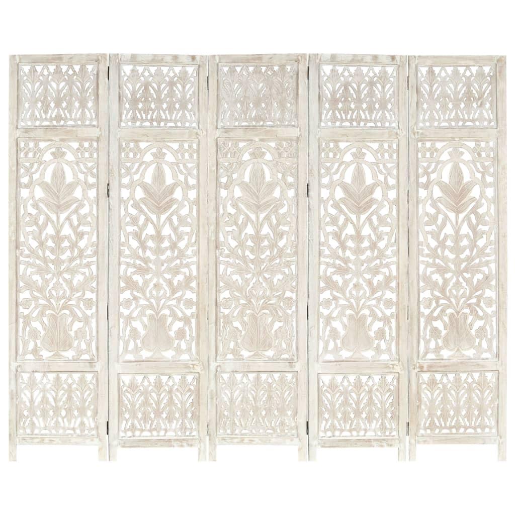 5-panels rumdeler håndskåret 200x165 cm massivt mangotræ hvid