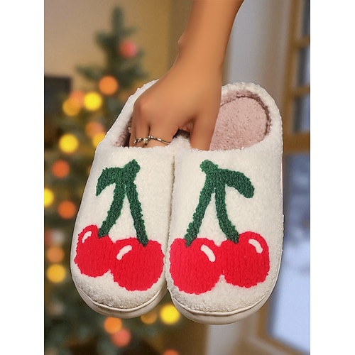 pantofole da donna in pile con graziosi ricami di ciliegie, calde pantofole da casa per l'inverno natalizio, per la camera da letto e per la casa accogliente