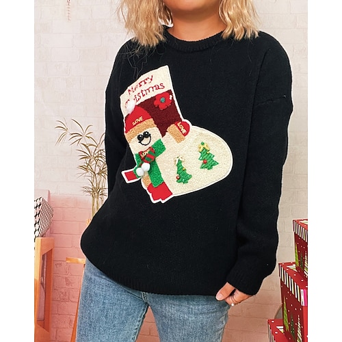 Per donna Felpa Maglione Pom Pom regalo di Natale Streetwear Pupazzo di neve A Coste Girocollo Lavorato a maglia Manica Lunga Top Regolari Maglia Natale All'aperto Ferie Nero Rosso Autunno Inverno