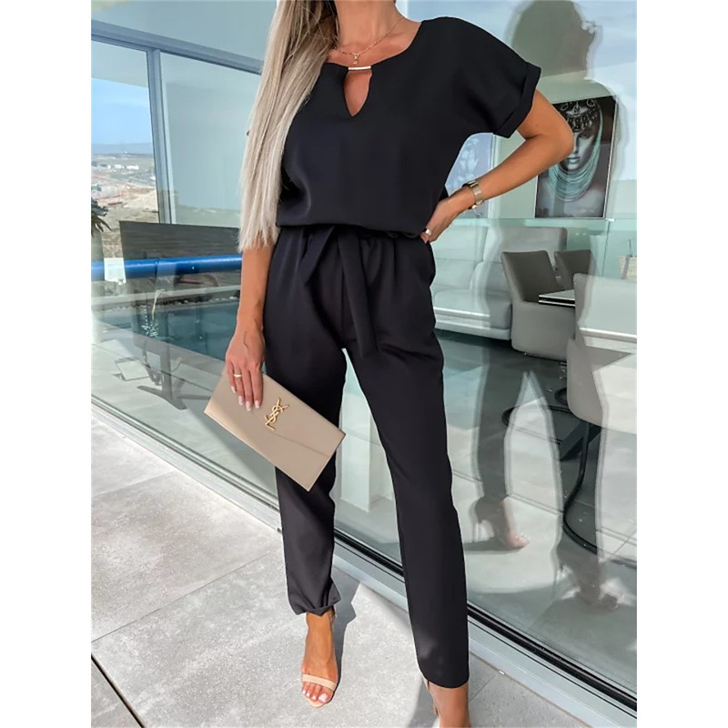 Women's Jumpsuits Casual Summer Lace up High Waist Solid Color Crew Neck Business Office Work Loose Fit Short Sleeve Black Pink Fuchsia S M L