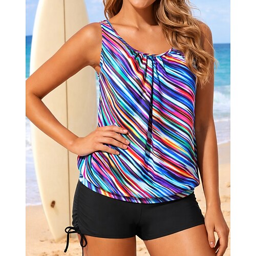 Per donna Costume da bagno Tankini Costume da bagno a due pezzi A righe Controllo della Pancia Elastico Senza Maniche Costume da Bagno Surf Spiaggia Vacanze Estate