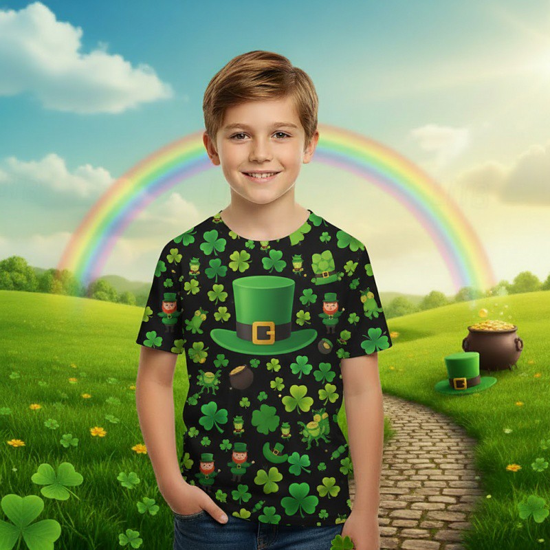St. Patrick Boys 3D Graphic Four Leaf Clover T shirt Tee Short Sleeve Summer Spring Fashion Basic Kids 4-12 Years Crew Neck Outdoor Casual Daily Regular Fit