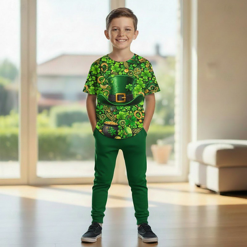 St. Paddy's Day Boys' 3D Graphic Four Leaf Clover St. Patrick's Day Pajamas Pajama Sets Tee Pants Pajama Sets Short Sleeve 3D Print Summer Active Neutral Fashion Kids 4 years Crew Neck Daily Home