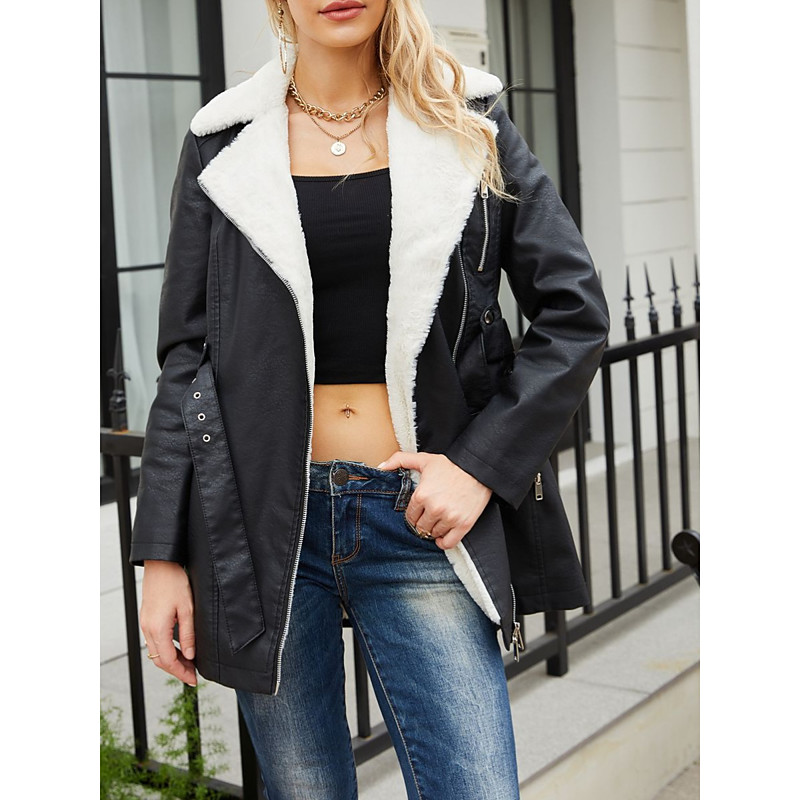 Women's Faux Leather Jacket Parka Comfortable Breathable Zipper Pocket With Belt Modern Casual Plain Vacation Street Casual Daily Wear Zipper Regular Turndown Regular Fit Long Sleeve Outerwear Black