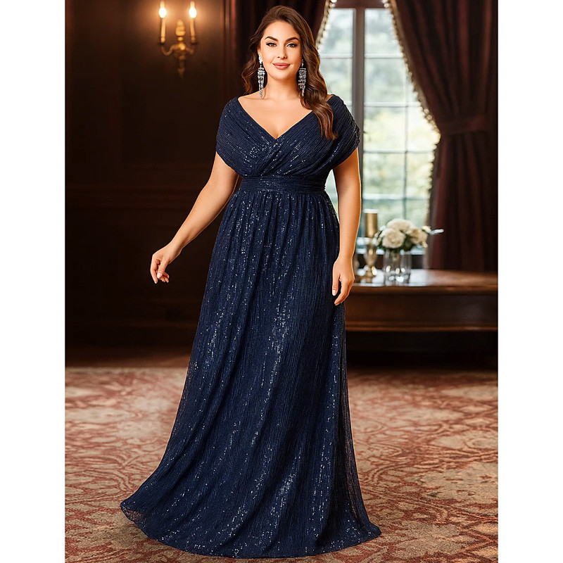 A-Line Floor Length Wedding Guest Dress Formal Dresses Evening Gown Mother of the Bride Dress Short Sleeve V Neck Elegant Vintage Plus Size with Pleats Sequin