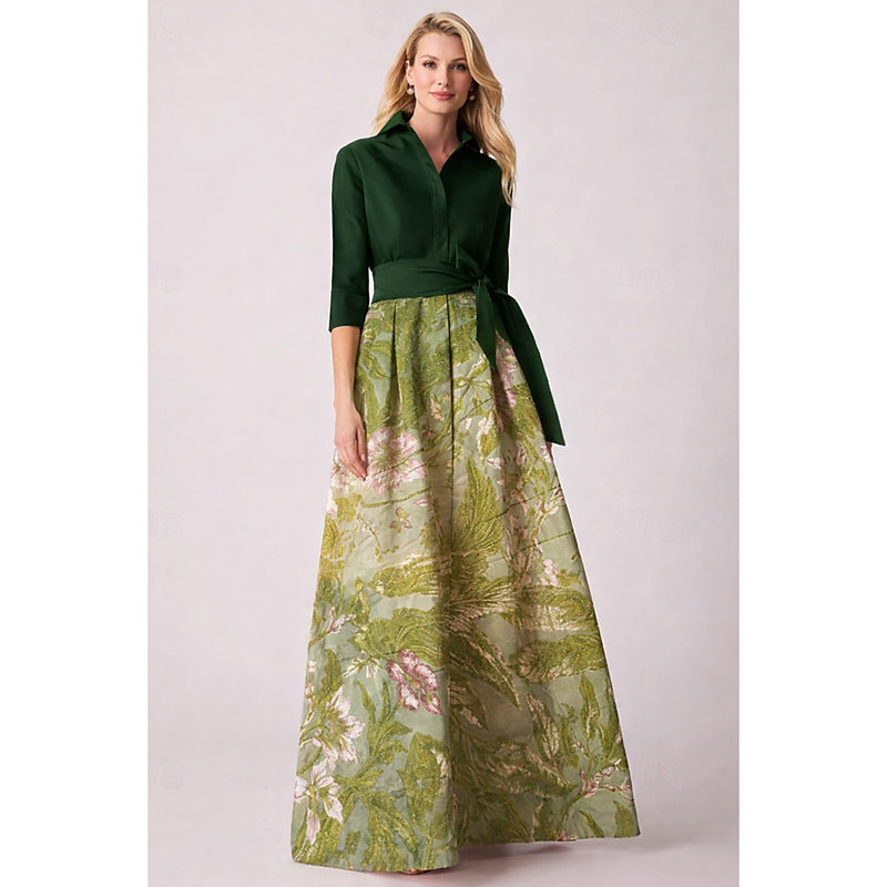 A-Line Floor Length Shirt Dress Wedding Guest Dress Formal Dresses Mother of the Bride Dress 3/4 Length Sleeve Shirt Collar Elegant High Split Wedding Formal Satin with Floral Print Bow(s) Slit