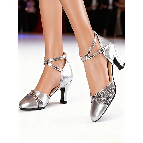 scarpe da ballo da donna argento glitterate con cinturino alla caviglia e tacco medio - ideali per salsa, balli da sala e feste