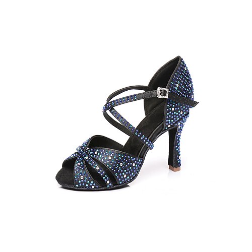 Scarpe da ballo latino in raso nero da donna – sandali da ballo con cinturino e tacco alto con fibbia in strass per spettacoli, feste e gare
