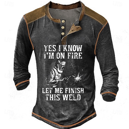 Maglietta a Manica Lunga da Uomo Saldatore Grafica Henley 'Sono In Fiamme Fammi Finire Questa Saldatura' Umorismo sul Lavoro