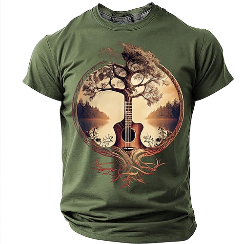 Maglietta da uomo con grafica albero della vita e chitarra acustica, tema natura, radici, surrealismo, musica, arte, folk, musicista, regalo, tramonto, paesaggio, stampa, casual, manica corta,