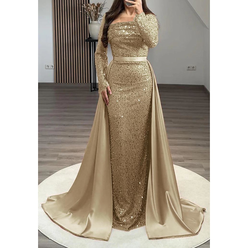 A-Line Floor Length Cocktail Dresses Evening Gown Ball Gown Formal Dress Elegant Color Block Glittering Long Sleeve Crew Neck Wedding Formal Pocket Satin Sequined with Sequin Pocket