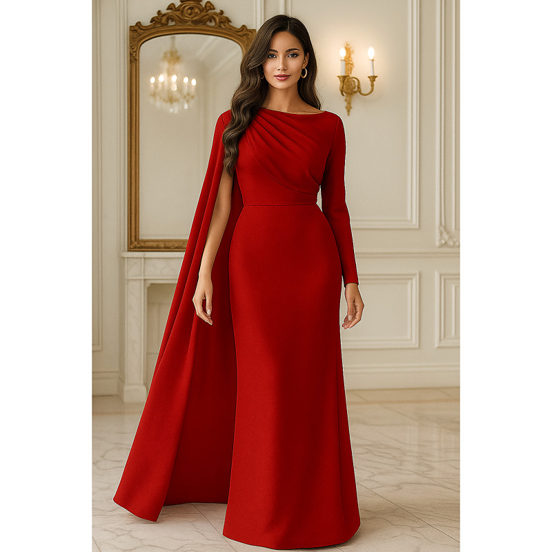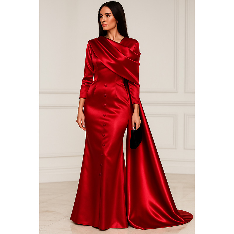 Mermaid Trumpet Floor Length Ball Gown with Cape Evening Gown Formal Dress Elegant Silky Long Sleeve Queen Anne Wedding Formal Capes Satin with Pleats Shawl