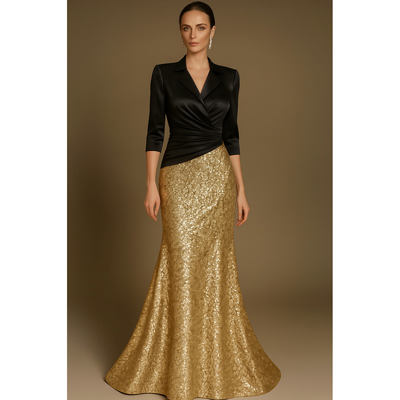 A-Line Floor Length Prom Dresses Evening Gown Ball Gown Formal Dress Elegant Color Block Glittering Half Sleeve Lapel Wedding Formal Stretch Satin Sequined with Glitter Pleats