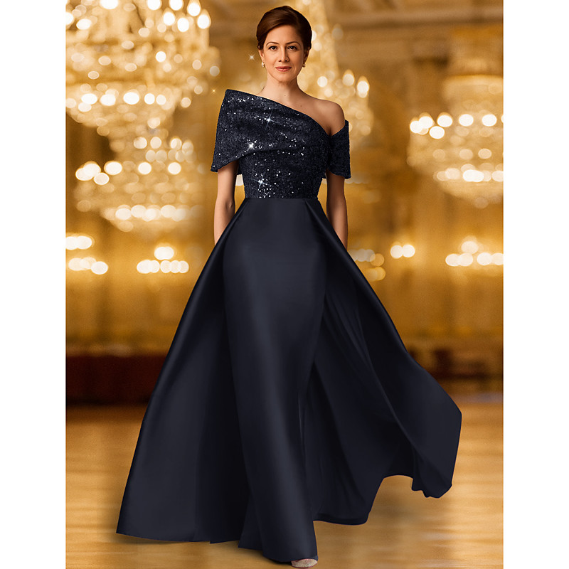 A-Line Floor Length Evening Gown Ball Gown with Overskirt Formal Dress Elegant Glittering Silky Short Sleeve One Shoulder Evening Party Wedding Satin Sequined with Glitter