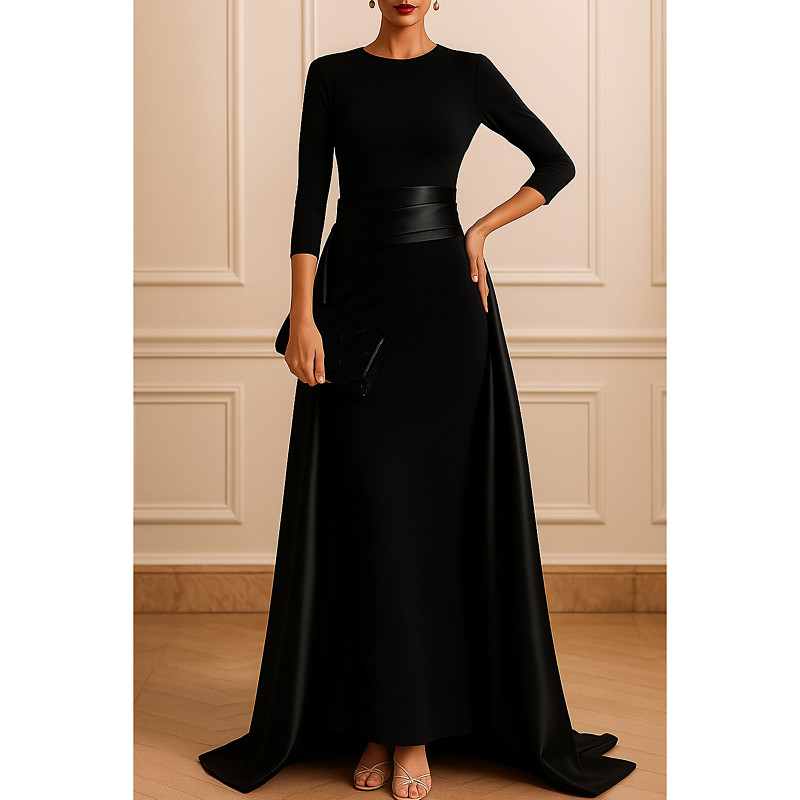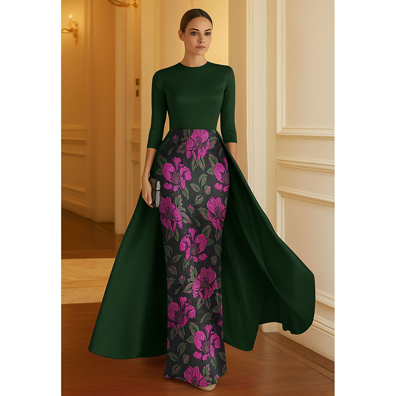 Sheath Column Floor Length Evening Gown Ball Gown with Overskirt Elegant High Split 3/4 Length Sleeve Crew Neck Wedding Formal Stretch Crepe with Pleats