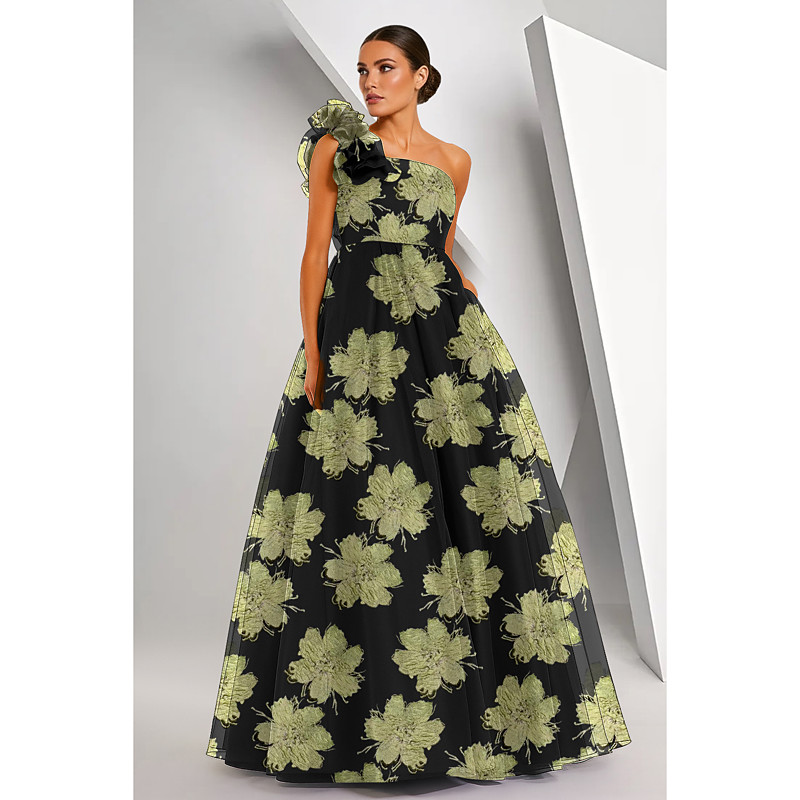 A-Line Floor Length Evening Gown Ball Gown Formal Dress Elegant Silky Sleeveless One Shoulder Wedding Formal Pocket Organza Jacquard with Ruffles