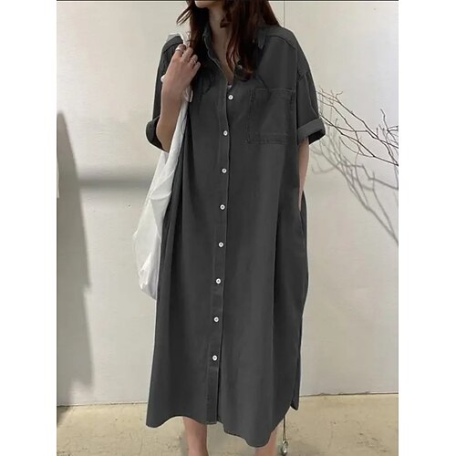 Per donna Abito maxi Finto cotone e lino Abito Camicia Abito Bianco Casual Quotidiano Weekend Vestibilità comoda Semplice Manica 3/4 Girocollo Blu Nero Bianco Rosso Estate Primavera